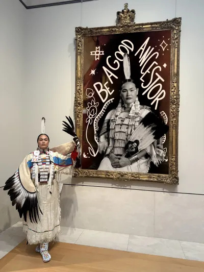The grand plumage belonged to a traditional dress worn by Acosia Red Elk (Umatilla, Cayuse & Nez Perce), who stood, arms outstretched, in front of Thomas Sully’s monumental portrait of Queen Victoria (1819–1901) on view in the museum’s American Wing. Queen Victoria and the British Empire, if one remembers, played a crucial role in the colonization of what is today known as Canada, including the establishment of the residential school system that separated Indigenous children from their culture. Red Elk attended a boarding school, though its conditions had improved by her time, she said. Critics point out that Victoria’s colonial legacy lingers in the form of government inaction around the crisis of clean drinking water on First Nations, as well as the disproportionate violence experienced by its members.